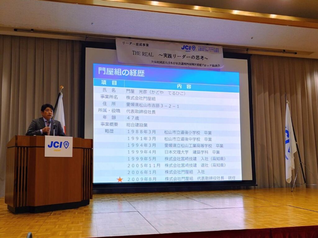 リーダー育成事業「THE REAL 実践リーダーの思考」では、松山青年会議所の歴代理事長であり、2014年に第63回全国大会松山大会の実行委員長を務められた門屋先輩にご講演いただきました。